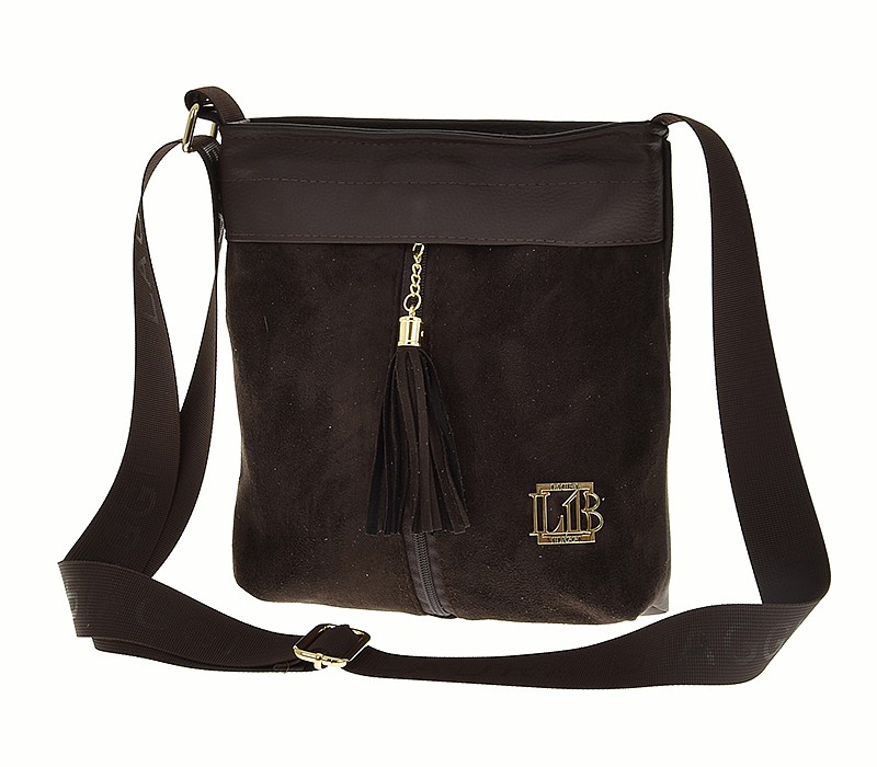- přední díl je vyrobený z boušené eko kůže - semiš, doplněný matnou strukturovanou eko kůží v horní části kabelky, zdobený zipem a ozdobou z třásní, zlaté logo LB